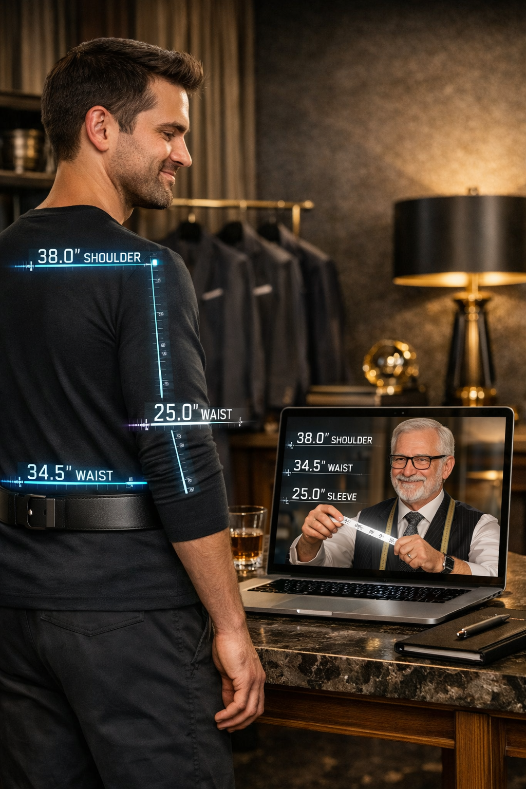 Ready Suit Go is your virtual bespoke tailor shop — where modern innovation meets the warmth of true craftsmanship. We use advanced digital tools to capture your fit with precision, but every decision, every stitch, every detail is guided by real tailoring expertise.